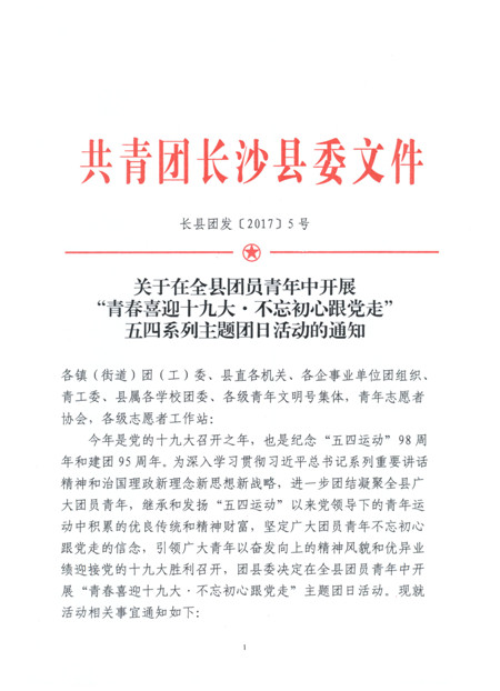 关于在全县团员青年中开展 “青春喜迎十九大·不忘初心跟党走” 五四系列主题团日活动的通知